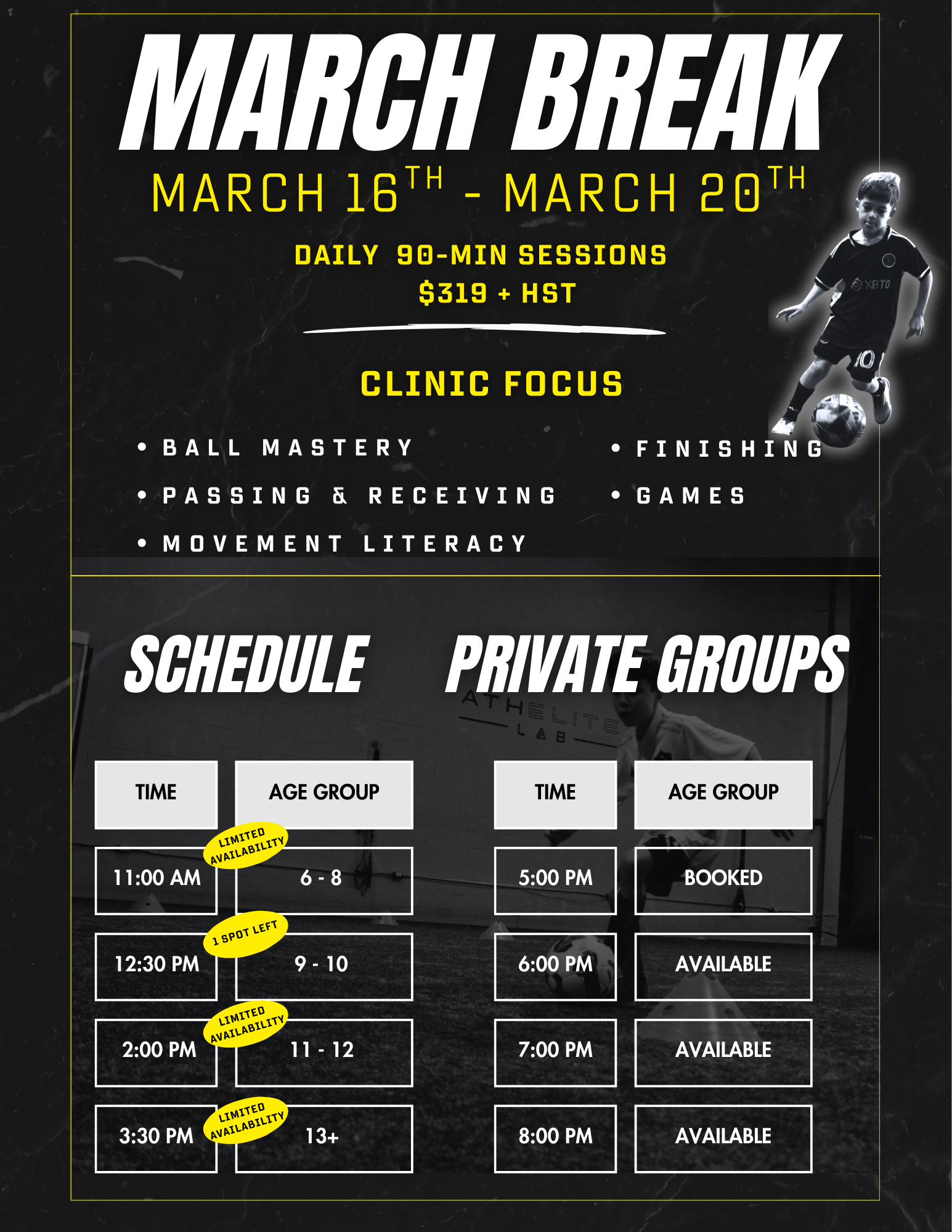 PRIVATE GROUPS: Have your own group? Bring a minimum of 4 players and train with us during March Break! Availability open after 5:00pm