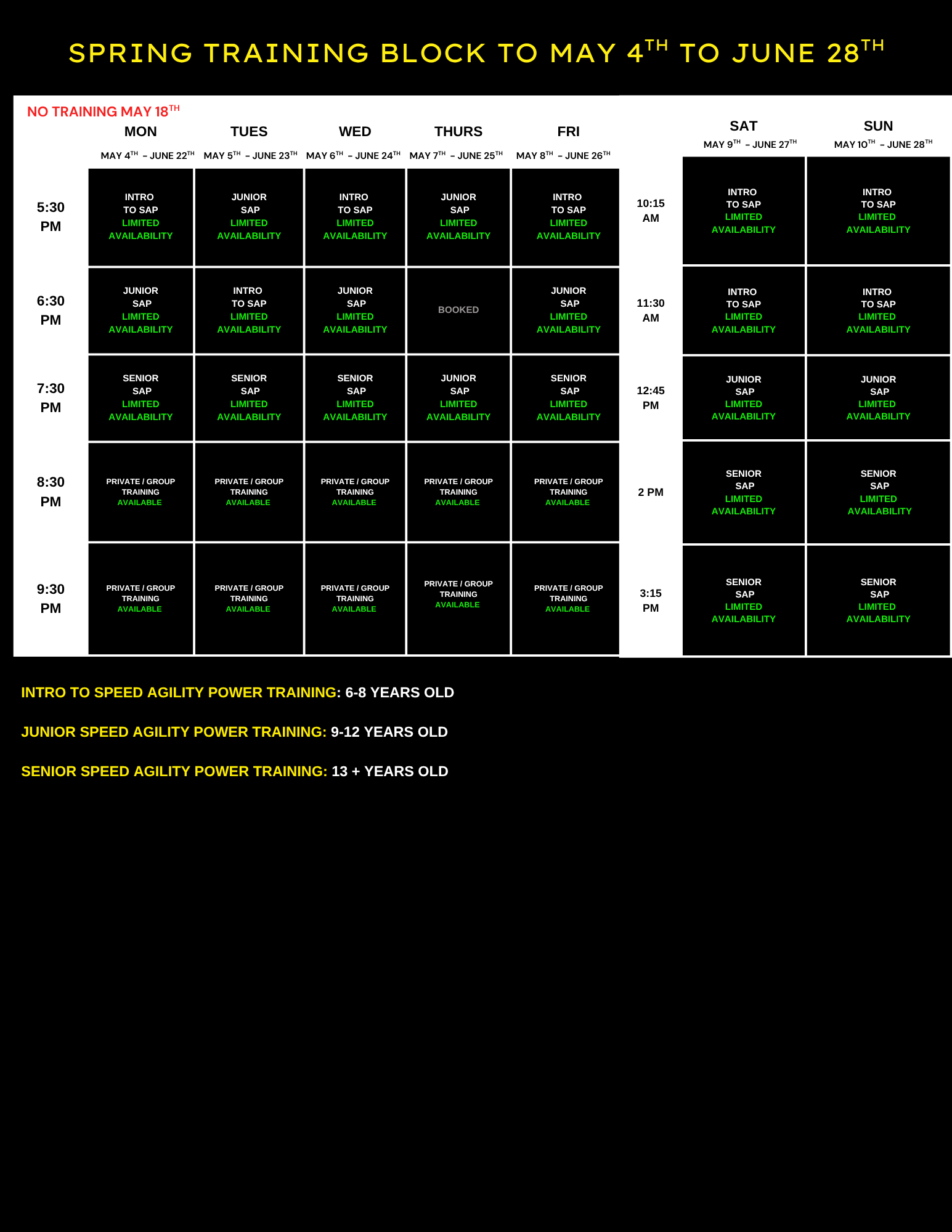 This program introduces athletes (IR: 10–13, SR: 14+) to structured speed, agility, and power training in a safe, progressive environment. Sessions focus on developing strength, coordination, speed, and movement efficiency while reducing injury risk and supporting long-term athletic performance.
