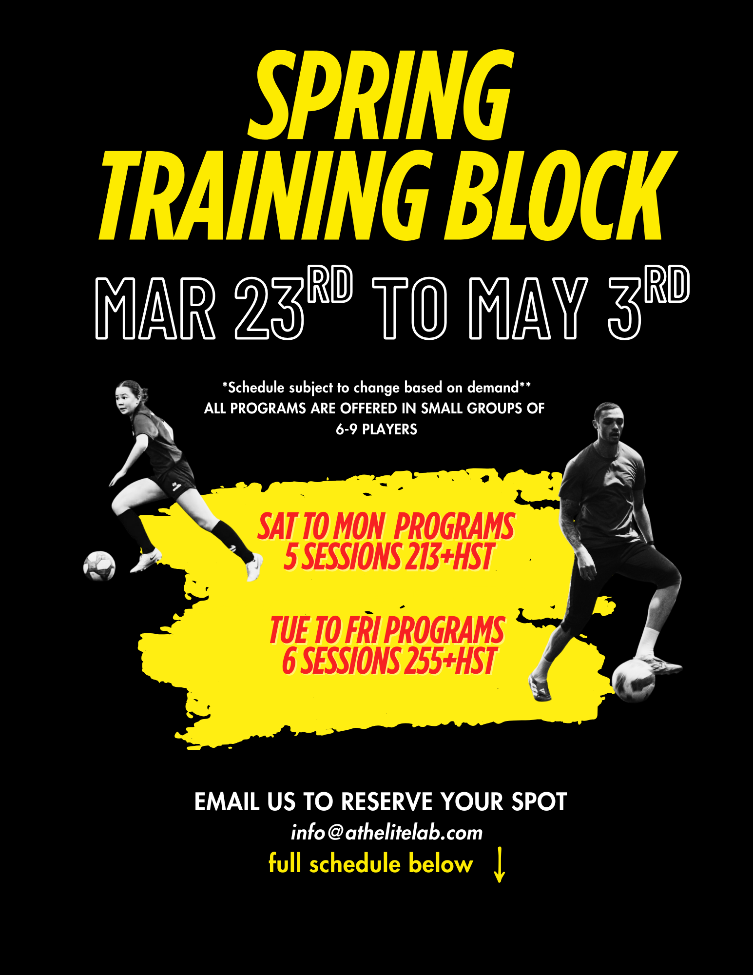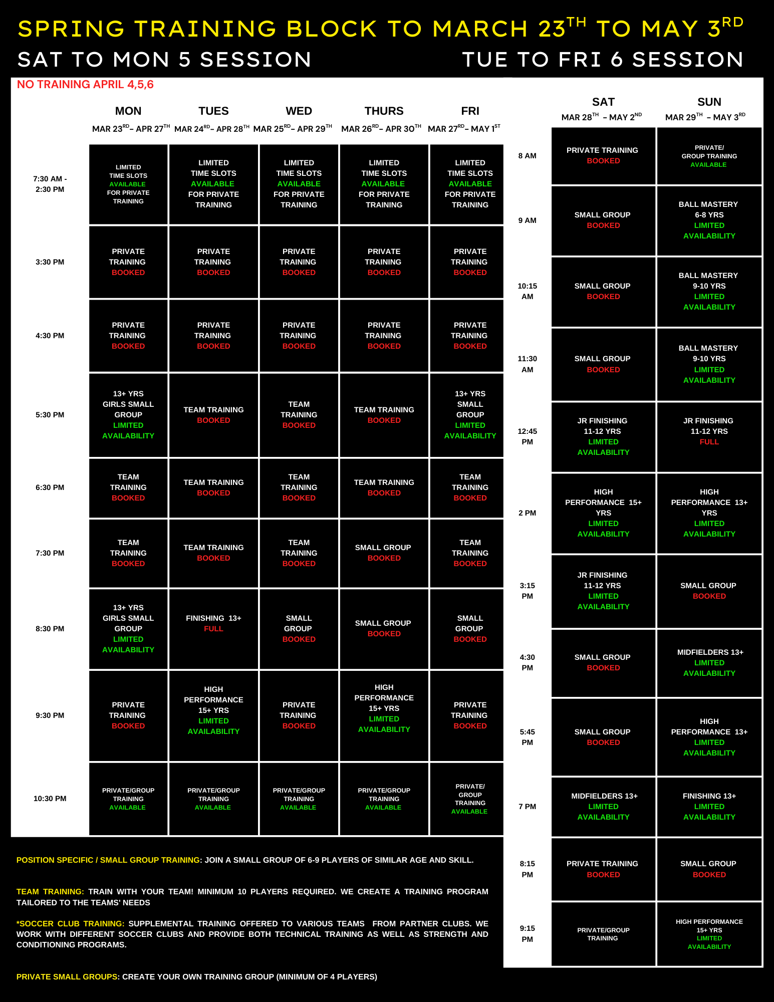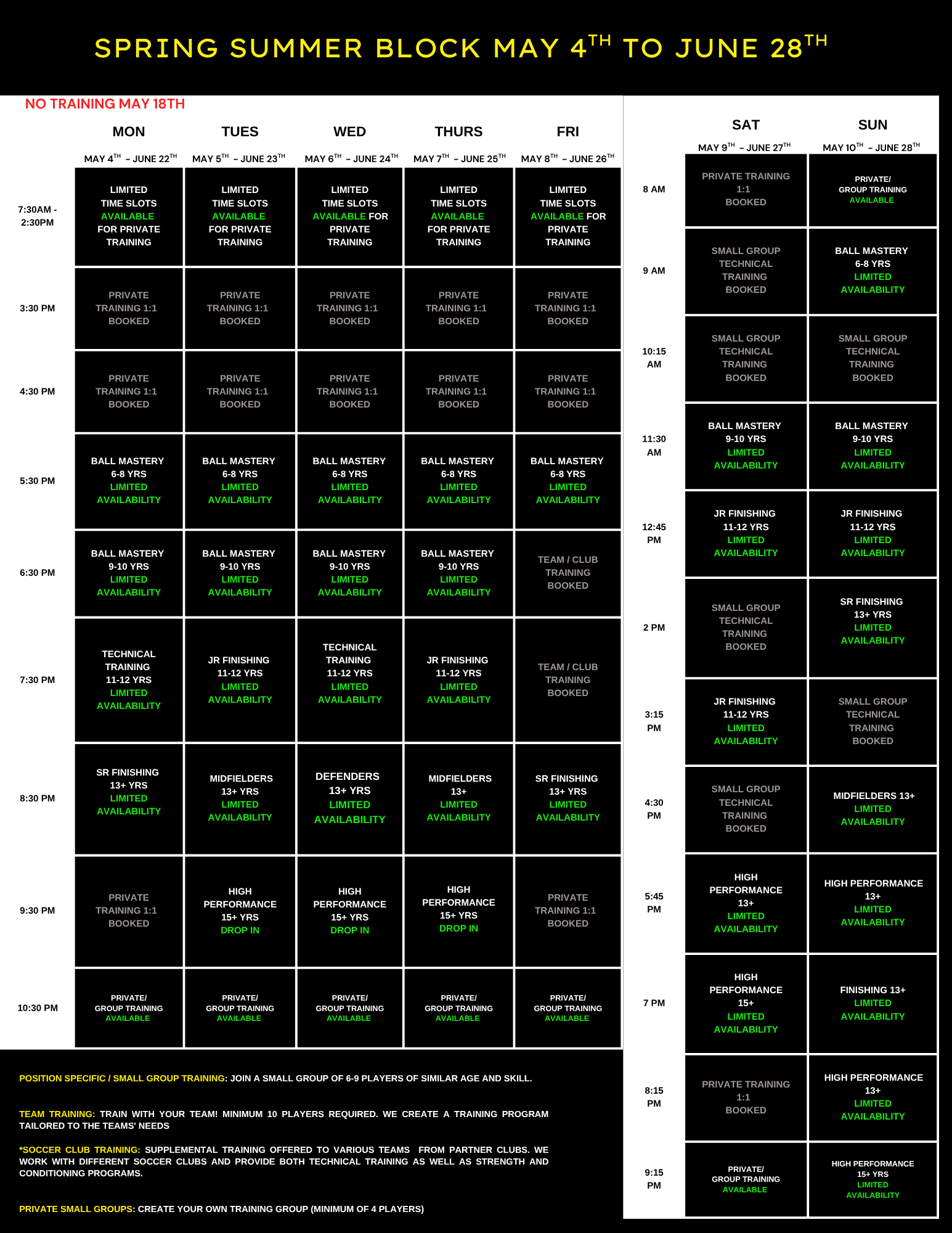 Technical training programs are offered in small group or team settings and follow a fixed, seasonal schedule. Program length varies by season and includes Ball Mastery, Technical Development, and Position-Specific Training.